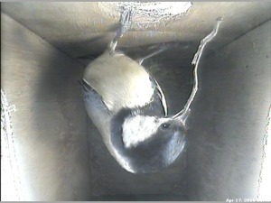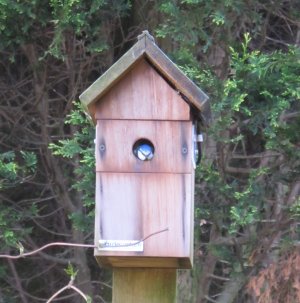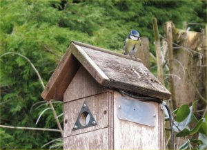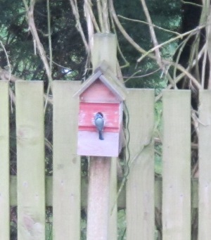 Over the weekend we have had action in both boxes 1 and 3. It looks like the Great Tits are thinking about nesting in box 1 as a little more nesting material has been added today, with the female doing 'nesting wriggles'. The Blue Tits spent some time over the weekend inspecting box 3, but no nesting has started in here. The male seemed to spend all his time trying to entice the female to go into the box!