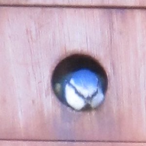 The Great Tits have chased off the Blue Tits this morning and are now trying to remove nesting material from the box!! The "stick" was to long to get out of the hole.