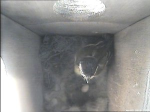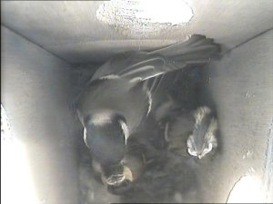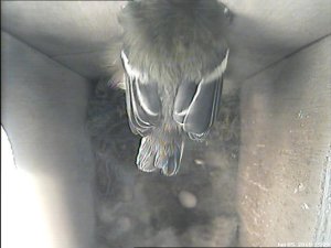 Biggest bird keeps getting up on the windows - think he will definitely go today - the other one does not look big enough as his wings are not as developed. there are also lots of little maggot things in the box. Excitement as a little brown bird tries to look in the box and the mother hisses at it.